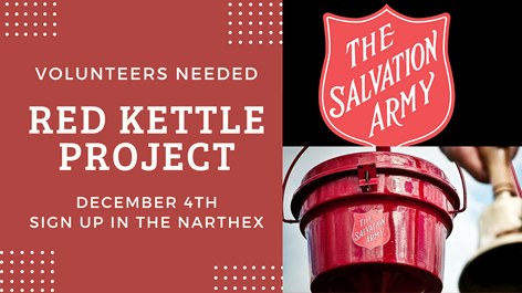 Our congregation will again ring the bell for the Salvation Army’s Red Kettle Project at The Butcher Shoppe on Thursday, December 4th from 7:00 am until 7:00 pm.