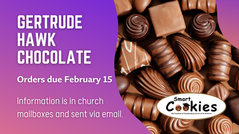 Smart Cookies Fundraiser – “Gertrude Hawk” Chocolates. *Click Here to view the Gertrude Hawk catalog* Sales begin today and run through February 15th. Catalog, order form, and information is provided in your church mailbox and on the church’s website. Please place completed order forms and che , ...